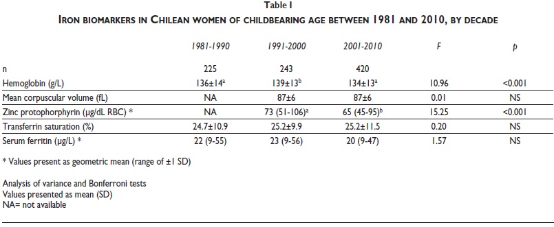 Materials and methods. Calculation of the prevalence of anemia and iron status was based on multiple cross-sectional iron absorption studies performed in 888 women during this period of time. All studies included measurements of hemoglobin, mean corpuscular volume, zinc protoporphyrin, percentage of transferrin saturation and serum ferritin. Data were grouped by decade (1981-1990, 1991-2000, and 2001-2010).