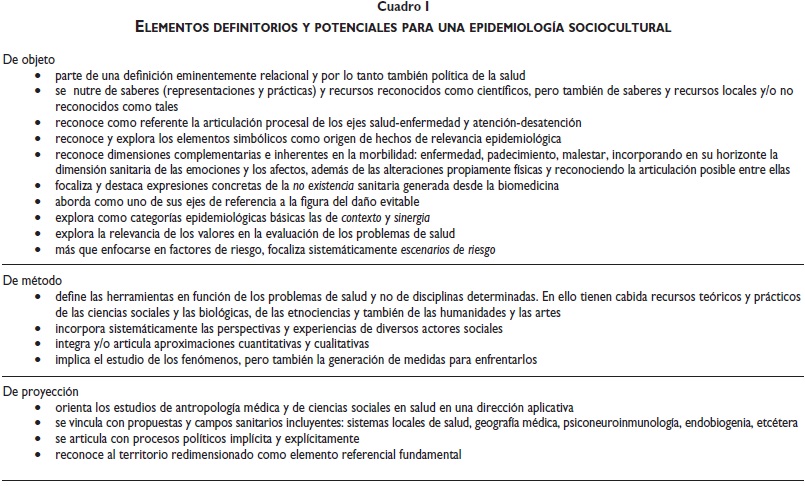 El planteamiento de una epidemiología sociocultural (ES) emana de diversas reformulaciones propuestas ante la necesidad de ampliar y profundizar la mirada epidemiológica, destacando la multiplicidad de escenarios y voces relativos al proceso salud-enfermedad y sus formas inherentes de atención-desatención. Un señalamiento es que la bioepidemiología se ha dedicado más a preguntas como ¿por qué se enferman los individuos?, que a inquirir por qué las poblaciones tienen un determinado perfil de salud o por qué determinados problemas predominan en determinadas poblaciones.4,5 Si bien etimológicamente el término "epidemiología" implica una perspectiva de globalidad, en la reflexión y la práctica esa amplitud identitaria ideal es constreñida precisamente por las condiciones sociopolíticas que determinan la construcción de disciplinas y campos de acción. A su vez, desde la antropología médica, resulta necesario un referente operativo y vinculante que oriente, articule y optimice sus aportes a la salud pública.16