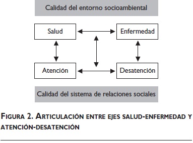 A su vez, la ES pretende el estudio de los factores de riesgo en una clave preventiva estructural, considerando a la realidad biológica y ambiental en su íntima relación con la cultura y las relaciones socioeconómicas y políticas. Su eje teórico asume como objeto de estudio un proceso dinámico que nunca se expresa como una "historia natural de la enfermedad" ajena a las relaciones sociales; de ahí que el eje atención-desatención ha de ser también analizado explícitamente como tal. En este sentido, los procesos de salud-enfermedad y de atención-desatención están siempre mediados simbólicamente, manteniendo connotaciones tan trascendentes como las emanadas de los factores biológicos, pues expresan y motivan relaciones, conflictos, intereses y valores de raigambre política y cultural.42 La ES pretende reconocer además el papel que juegan la teoría y los valores de los diversos actores investigadores incluidos en la evaluación de problemas sanitarios y aspectos estructurales que definen el perfil epidemiológico más allá de su significación estadística, con el fin explícito de incidir propositivamente en ellos. Ello no supone soslayar la dimensión individual de los procesos articulados de salud-enfermedad y atención-desatención ni su expresión cuantitativa, sino integrar tal dimensión con sus determinantes socioculturales (figura 2). En síntesis, toda esa articulación constituye la tarea de una ES, entre cuyas categorías obligadas está la de sinergia, al relacionar la concatenación de varios factores causales de enfermedad con el modo y curso de vida, enfatizando la susceptibilidad general43 como referente cercano al concepto de sindemia, utilizado para explicar la comorbilidad por la influencia de múltiples factores.44 Aparecen así lazos con propuestas incluyentes y relacionales, como los sistemas locales de salud,45 la psico-neuroinmunología,46 la endobiogenia relativa a la particularidad fisiológica dinámica de cada individuo41 y las nuevas reformulaciones de la geografía médica.47