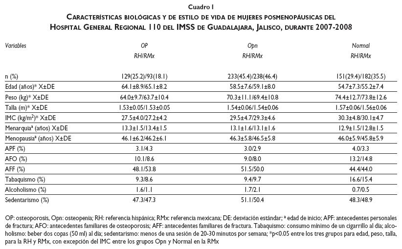 Los factores de riesgo para OP son biológicos y de estilo de vida. Se estima que 46-62% de la variación en la densidad mineral ósea (DMO) depende de factores genéticos.9 En México se han descrito como factores de riesgo para OP edad avanzada, menopausia temprana, menarquia tardía, lactancia prolongada y alcoholismo, en mujeres posmenopáusicas de San Luis Potosí4 y la Ciudad de México.8 Además se conoce que existen diferencias geográficas en peso, talla, índice de masa corporal (IMC) y DMO entre la población mexicana,3 por eso consideramos importante analizar los factores de riesgo para OP con puntos de corte específicos para cada población. El objetivo de este trabajo es conocer los factores de riesgo y la frecuencia de OP en mujeres posmenopáusicas usuarias de un hospital de Guadalajara, Jalisco.