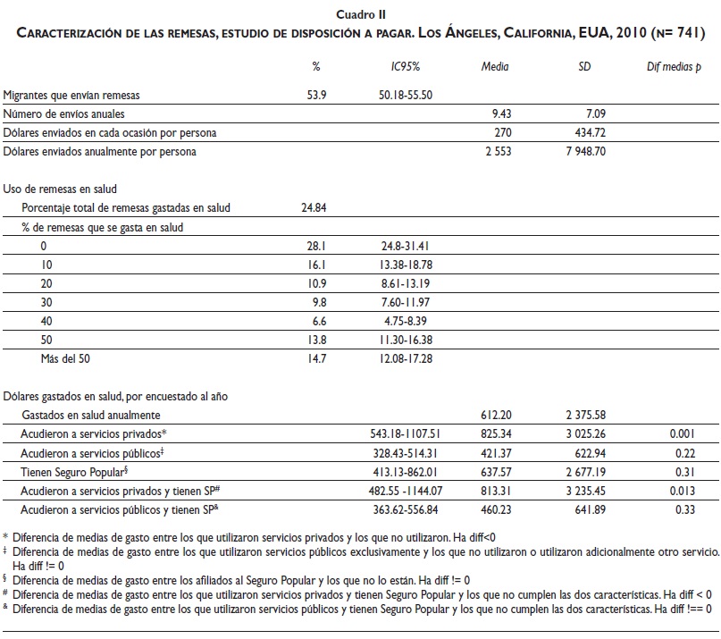 La media anual de dólares gastados en salud es de 612. Sin embargo, entre los dependientes que acudieron a servicios privados la media es significativamente mayor, con 825 dólares, que los que utilizaron proveedores públicos, con 293 dólares. La media anual de gasto en servicios privados de salud de los dependientes afiliados al Seguro Popular es de 813 pesos. Lo que sugiere que el Seguro Popular no resulta protector para el gasto de remesas para los usuarios de servicios de salud en general y en particular para los privados (cuadro II).
