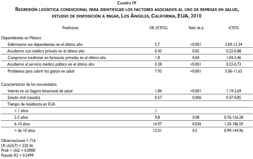 En el modelo de regresión logística (cuadro IV), los principales determinantes para el uso de las remesas para atención a la salud fueron tener familiares enfermos en el último año, haber comprado medicamentos en farmacias privadas y haber tenido dificultades para pagar los gastos en salud. Los que acudieron a médicos públicos o privados de salud tuvieron menor probabilidad de utilizar las remesas para atender problemas de salud. El tiempo de residencia de los migrantes en EUA también tuvo significancia, siendo los que tienen residencia entre 6 y 10 años los que tuvieron mayor probabilidad de utilizar remesas para atención a la salud.