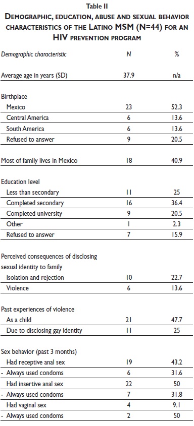 More than half of the men (52%; n = 23) were born in Mexico. The remaining participants were equally split between being born in Central America and South America (14% or n = 6 for each). Forty one percent of the men (n = 18) reported that most of their family live in Mexico. Over a third of the sample (36%) had completed secondary school and another 20% had completed university education (table II). There were no significant differences between the control group and the intervention group along any of the demographic variables.