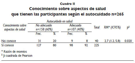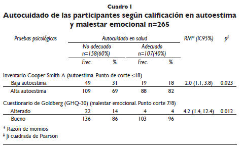 Señor editor: Históricamente, las enfermeras han enseñado a las personas a cuidarse, aunque ellas mismas no necesariamente cuiden su salud.1 Las enfermeras tienen un deficiente autocuidado al vivir un doble sentido del deber; ser mujer y ser enfermeras. Esta situación las distrae y les produce confusión por los diferentes roles,2 y son afectadas por su entorno y su labor. Por lo anterior, se diseñó un estudio transversal en enfermeras de una institución especializada en salud reproductiva de la Ciudad de México, para investigar sobre sus conocimientos y prácticas de autocuidado en salud y su estado físico y emocional mediante las evaluaciones correspondientes. El estudio fue aprobado por el Comité de Investigación y Ética Institucional. Para evaluar prácticas y conocimientos de autocuidado se aplicó un cuestionario médico/nutricio, validado en apariencia y contenido. Para calificar autoestima se empleó el Inventario Cooper Smith (25 reactivos y punto de corte ≤18) y para valorar malestar emocional se utilizó el Cuestionario General de Salud de Goldberg (GHQ-30, punto de corte 7/8). Se determinaron peso, estatura, índice de masa corporal (IMC),3 cintura, presión arterial, glucosa y lípidos. Se utilizó ji cuadrada de Pearson, razón de momios con intervalo de confianza 95%. Participaron 265 enfermeras, de edad promedio de 41 años; 60% tuvo prácticas de autocuidado inadecuadas, 15% conocimientos deficientes en cuidados de salud, 25% baja autoestima y 10% malestar emocional. De las participantes con prácticas inadecuadas de autocuidado, 31% presentó baja autoestima (RM= 2.0; IC95% 1.1-3.8) y 14% malestar emocional (RM= 4.2, IC95% 1.4-12.5) (cuadro I). No tener conocimiento óptimo sobre aspectos de salud implicó casi tres veces más riesgo de tener autocuidado deficiente (RM 2.7; IC95% 1.2-5.8) (cuadro II). Las participantes presentaron dislipidemia 45% e hiperglucemia 67%. Ochenta por ciento tuvo sobrepeso-obesidad (principalmente en turno nocturno) mayor al reportado por otros estudios de enfermeras (65 y 76%)4,5 y a nivel nacional (73%).6 Sí se tienen conocimientos en cuidados de salud pero no se aplican; la baja autoestima y el malestar emocional aumentaron el riesgo de no cuidar su salud. Por lo anterior, se deben implementar estrategias que mejoren la autoestima y disminuyan malestar emocional para optimizar sus prácticas de autocuidado.