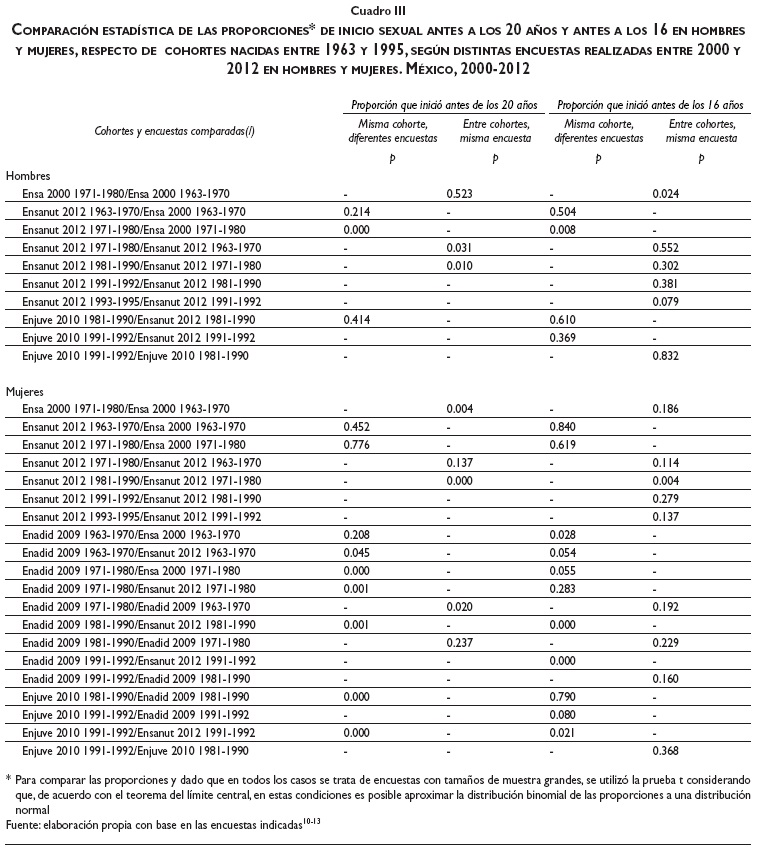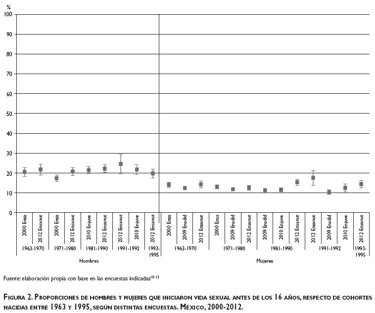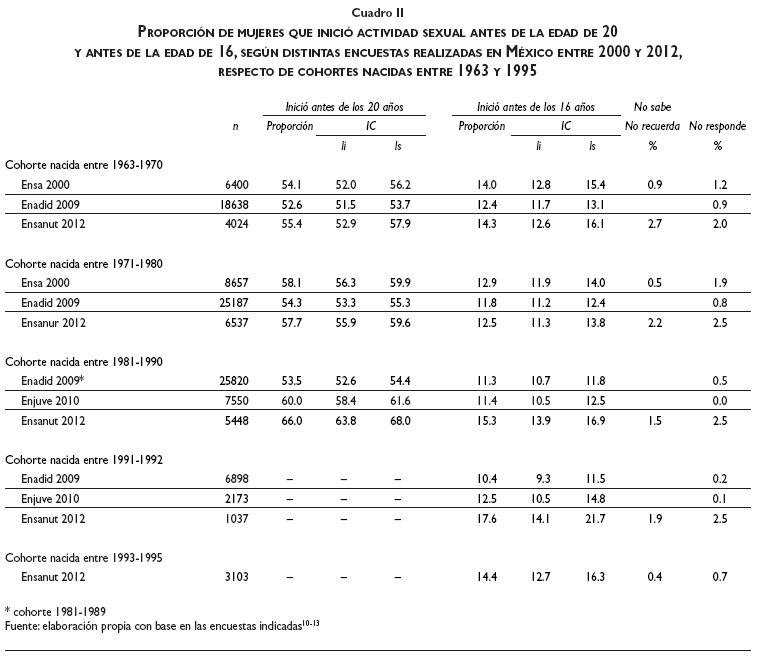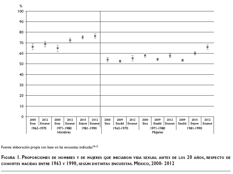 La Ensanut 2012, que es la fuente de datos que permite analizar más cohortes, presenta un incremento en la proporción de hombres y mujeres que tuvieron relaciones sexuales antes de los 20 años (con diferencias significativas entre las distintas cohortes, en el caso de los hombres, y sólo entre las cohortes de 1981-1990 y 1971-1980, en el caso de las mujeres) y una tendencia que no es clara en relación con quienes iniciaron antes de los 16 años (cambios no significativos en el caso de los hombres, y significativos únicamente al comparar las cohortes de 1981-1990 y 1971-1980, en el caso de las mujeres).