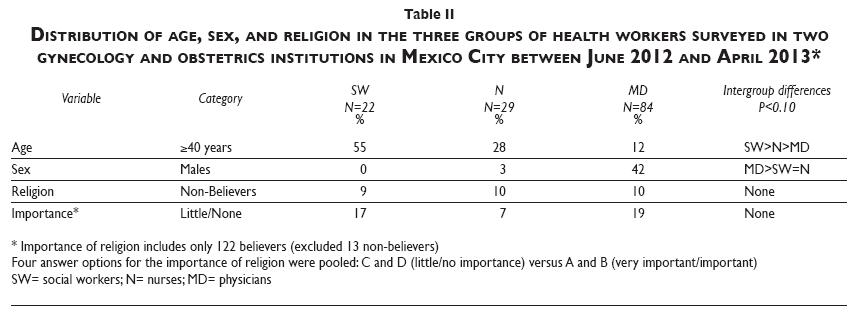 All of the subjects who were invited to participate agreed to join the study. Three groups of health workers participated including 22 social workers, 29 nurses, and 84 physicians (obstetricians, pediatricians, and geneticists). Nurses (with one exception) and social workers were all women, and more than half of the physicians (58%) were women. The median age was 32 years (range, 2373 years). There was no difference in the proportion of believers or in the importance of religion in their daily lives (table II).