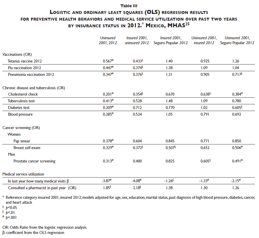 Materials and methods. Data from the Mexican Health and Aging Study (MHAS/Enasem) 2001 and 2012 were used. Logistic and ordinary least squares regression adjusted models were used to predict preventive care in 2012 by insurance status categories in 2001-2012, as the focus explanatory variable.