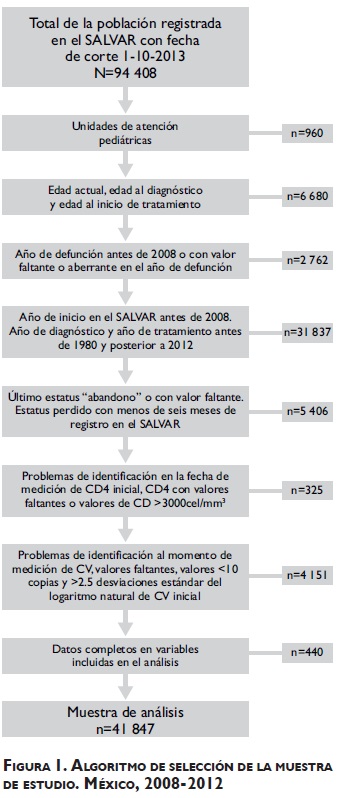 Analizamos información proveniente del Sistema de Administración, Logística y Vigilancia de Antirretrovirales (SALVAR) del periodo 2008-2012. SALVAR es un sistema nacional de registro electrónico de los pacientes VIH+ que reciben TARV gratuito por parte de la Secretaría de Salud en los SAI y CAPASITS de todo el país.13 Se trata de una herramienta electrónica diseñada para apoyar procesos de adquisición y distribución periódica de los medicamentos antirretrovirales (ARV), que además contiene información demográfica básica de los pacientes, los esquemas de ARV provistos y resultados de conteo de células CD4 y carga viral (CV).14 Para este análisis se seleccionaron 41847 pacientes distribuidos en las 32 entidades federativas del país (figura 1).