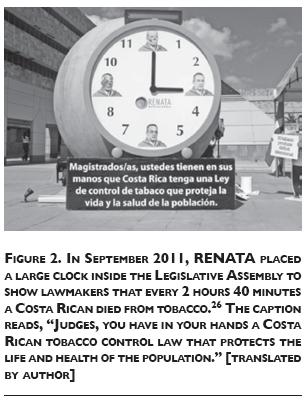 In September 2011, RENATA placed a large clock inside the Legislative Assembly to show lawmakers that every 2 hours 40 minutes a Costa Rican died from tobacco to help pressure the president to summon the bill for a vote in the full Legislative Assembly26 (figure 2). RENATA with the support of EnComunicación publicized the large clock and the importance of passing the strong bill, which again generated significant media coverage.p These efforts led President Chinchilla on November 30, 2011 to list the legislation passed in committee as one of her legislative priorities in the plenary session beginning in January 2012.27