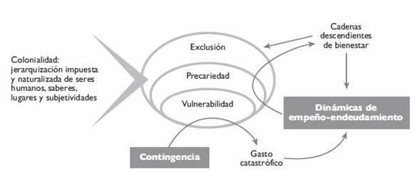 A pesar de su soslayo en programas sanitarios oficiales, las dinámicas de endeudamiento constituyen un marcador epidemiológico, al develar condiciones patogénicas de desatención estructural que expresan la jerarquización impuesta y naturalizada patogénica propia de la colonialidad. La contingencia, al surgir en una condición de vulnerabilidad económica y asistencial, deviene en un gasto catastrófico que genera a su vez dinámicas de empeño-endeudamiento que propician, en entornos de precariedad, cadenas descendientes de bienestar replicando esas dinámicas y la exclusión. El contexto de ese circuito es el de la colonialidad como un dispositivo social preexistente (figura 2). Analizar dicho fenómeno a nivel local y global constituye una tarea de salud pública compleja pero esencial. Finalmente, en términos metodológicos, las comisiones municipales de salud de genuino carácter participativo pueden ser instancias relevantes para involucrar a los pobladores en procesos compartidos de organización, promoción sanitaria e investigación de su propia realidad sanitaria.