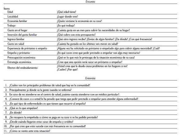 El estudio se realizó en el segundo semestre de 2014 como parte de un proceso de apoyo a la operación de la Comisión Municipal de Salud (Comunsal) de Santiago Tapextla, con participación de diversos actores locales y del gobierno municipal, explorando el potencial sanitario de saberes y recursos locales y la deliberación dialógica de iniciativas sobre problemas de salud (Proyecto Conacyt 101990). El protocolo de investigación fue aprobado en términos éticos por la Coordinación Nacional de Antropología del INAH, y se obtuvo el consentimiento informado por parte de los participantes. Se aplicó un cuestionario sobre dinámicas de empeño-endeudamiento a 75 madres de familia de entre 18 y 60 años, integrantes del programa Prospera y todas adscritas al Seguro Popular en las agencias y la cabecera municipal, 20 entrevistas a profundidad y seis reuniones de grupos focales (cuadros I y II). El criterio de selección e inclusión para aplicar el cuestionario, las entrevistas y para formar grupos focales fue su adscripción a dichos programas y su anuencia para participar. El tema también fue abordado por la Comunsal y en su Boletín de abril de 2015, participando personal médico e integrantes del cabildo.
