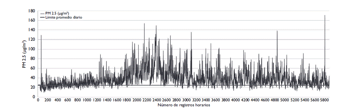 Nuestros hallazgos muestran que la única fuente de información con datos abiertos históricos sobre calidad del aire es la de la Embajada de Estados Unidos en Perú,8 la cual se deriva de los registros horarios de PM 2.5 obtenidos en una única estación de monitoreo en la ciudad de Lima. El total de registros incluidos de PM 2.5 desde el 29 de febrero (fecha de inicio de las mediciones) hasta el 31 de diciembre de 2016 fue de 7 286, con un valor promedio de 38.1 µg/m3 (rango: 10-170). Junio tuvo el mayor valor promedio de PM 2.5 con 55.2 µg/m3 (rango: 18-149). Asimismo, la mayor concentración promedio se registró a las 11 horas (47.5 µg/m3). Finalmente, un total de 5 833 registros horarios estaba por encima del límite promedio de riesgo diario de 25 µg/m3 (figura 1).