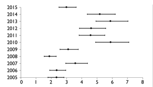 Figura 2 Aislamientos de E coli BLEE en pacientes con neoplasias hematológicas (barras negras, línea de tendencia continua) y en pacientes con tumores sólidos por año (barras grises, línea de tendencia punteada). México, Instituto Nacional de Cancerología, 2015