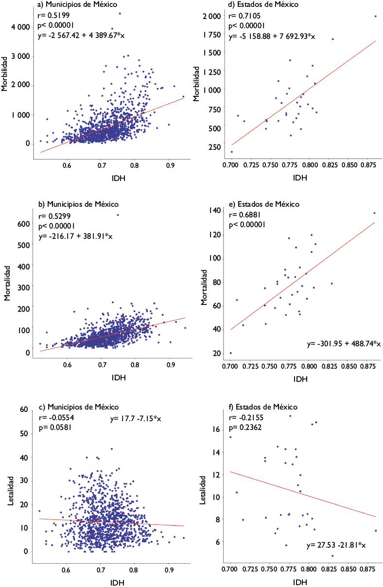 Se descargaron los datos abiertos de la Secretaría de Salud, donde se registran 992 228 casos confirmados y 96 517 defunciones al 11 de noviembre de 2020.1 Se calcularon las proporciones de morbilidad ([casos/tamaño de población]*100 000), mortalidad ([defunciones/tamaño de población]*100 000) y letalidad ([defunciones/casos]*100) por cada municipio y estado del país. Se aplicaron regresiones lineales ordinarias2 entre el índice de desarrollo humano (IDH) de los municipios y estados (publicados por el Consejo Nacional de Evaluación de la Política de Desarrollo Social [Coneval])3 con respecto a sus correspondientes proporciones de morbilidad, mortalidad y letalidad.
