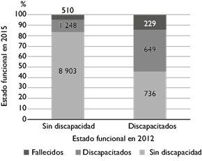 Se utilizaron modelos de regresión logística, donde la variable dependiente es el cambio en la discapacidad en el periodo 2012-15. Se aplicaron cuatro tipos de modelos, asociados con el cambio en el estado funcional: Sin discapacidad-con discapacidad; sin discapacidad-fallecido; con discapacidad-sin discapacidad, y con discapacidad-fallecido. Se utilizó como referencia a los grupos que no cambiaron de estado en ambas mediciones, sin discapacidad-sin discapacidad para los primeros dos modelos y con discapacidad-con discapacidad para los últimos dos.