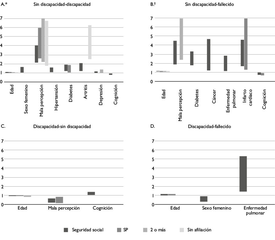 En el caso de las enfermedades asociadas con el desarrollo de discapacidad, éstas varían de acuerdo con la afiliación. En el caso del grupo de afiliados al SP es la diabetes (RM= 1.4); en el grupo con dos o más afiliaciones es la depresión (RM= 1.2); y en aquéllos sin afiliación es la artritis (RM= 4). En el caso del grupo con seguridad social, entre las enfermedades asociadas con la transición hacia la discapacidad se encuentran la hipertensión (RM= 1.3), diabetes (RM= 1.6), artritis (RM= 1.6) y depresión (RM= 1.1).