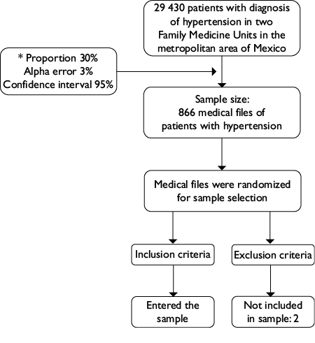 An analysis of the relationship between antihypertensive pharmacological costs and factors of patients with hypertension was conducted using data from two Family Medicine Units pertaining to IMSS for 2016 year. Costs were estimated by means of a cross-sectional, retrospective design, from the provider’s perspective study with a micro-costing technique (bottom up) for a 1-year time horizon (2016). Sources of data were electronic medical files (EMF) corresponding to 29 430 individuals diagnosed with hypertension regularly attending two Family Medicine Units for health care (figure 1). Selection of cases was conducted using simple random sampling with no replacement taking similar proportion of sample from each medical facility. Inclusion criteria were: age >18 years, non-pregnant, with a minimum of three primary care visits associated to hypertension per year. The sample size considered a proportions formula, 3% alpha-error and statistical power of 90% (figure 1).