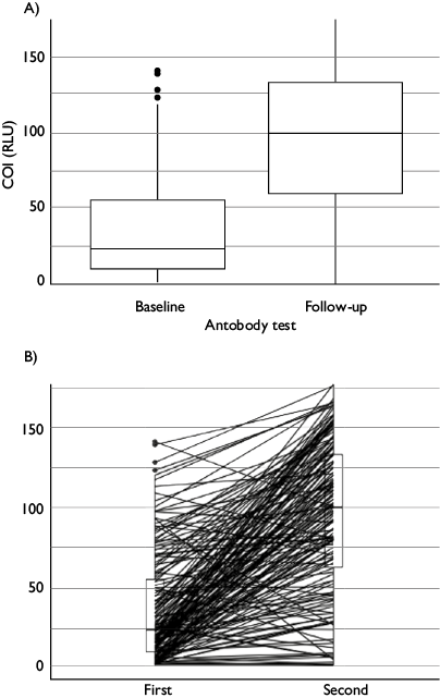 Figure 1 A) Quantitative luminescence values at first and second IgM/IgG tests. COI is expressed in RLU. Wilcoxon signed rank test p < 0.001. B) Individual changes from baseline to follow-up in antibody levels. Nuevo León, México, 2020
