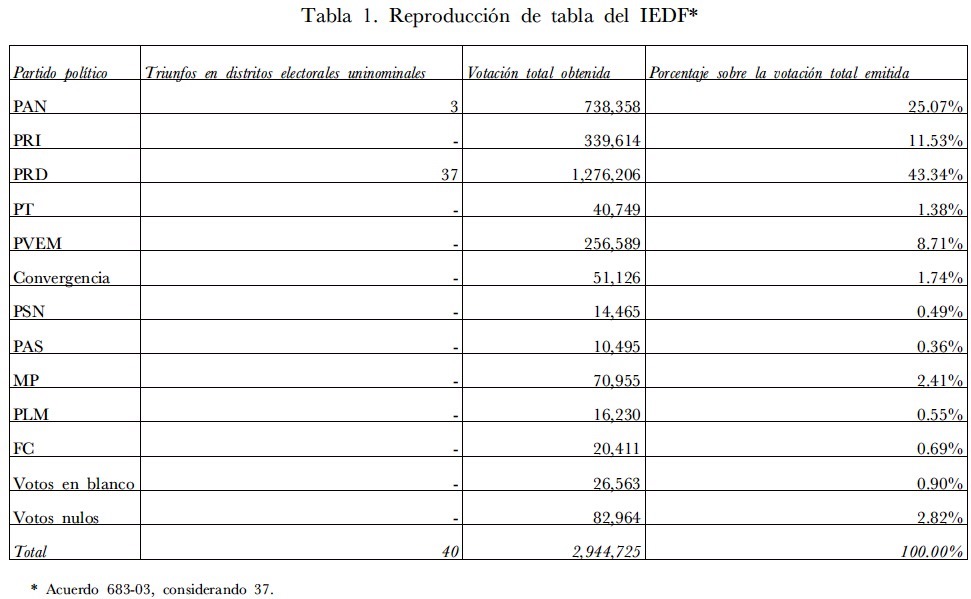 El Consejo General del IEDF, en votación dividida, asignó las diputaciones de representación proporcional a través de un acuerdo que se resume enseguida.4 El cómputo final de la votación se reproduce en la tabla 1, en la siguiente página.