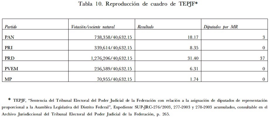 A partir de allí, el TEPJF desarrolló su propio procedimiento de asignación. En primer lugar, en forma coincidente con las dos instancias anteriores, determinó la votación efectiva en 2, 681, 722 votos. Luego, "en términos de lo dispuesto por el inciso c) del artículo 12, en relación con el inciso d) del diverso numeral 13", calculó el cociente natural, dividiendo la votación efectiva entre la totalidad de los integrantes (66) de la ALDF, lo que arrojó como resultado 40, 632.15.26 Hecho esto, verificó "cuántas veces se encuentra contenido dentro de la votación de los partidos participantes [con derecho a diputaciones de representación proporcional] el cociente natural, debiendo tener presentes las diputaciones que los institutos políticos obtuvieron por el principio de mayoría relativa" (tabla 10).27