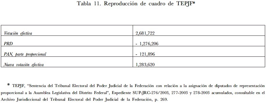 30 Ibidem, p. 269. En opinión de los autores, si el TEPJF quería seguir esta línea, hubiera sido más certero sustraer a la votación del PAN la que realmente obtuvo en los tres distritos uninominales que ganó.