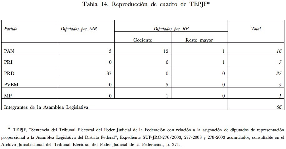 I. Antecedentes. II. La representación proporcional en el DF antes de las reformas de 2003. III. Asignación del Consejo General del IEDF. IV. Asignación del TEDF. V. Asignación del TEPJF. VI. El código reformado en 2003 y un ejercicio hipotético de asignación. VII. Cuantificación de la proporcionalidad. VIII. Conclusiones.