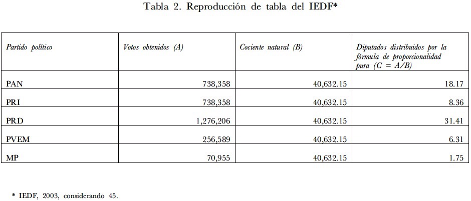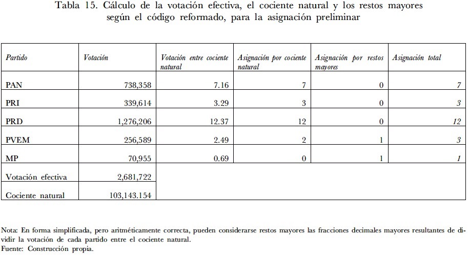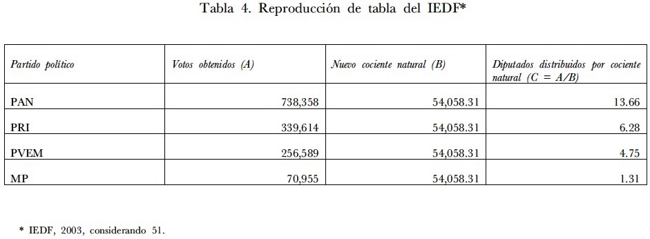 Al restar la votación del PRD a la votación total efectiva, el IEDF obtuvo una "nueva votación total efectiva" de 1, 405, 516 votos, y al dividir ésta entre 26 diputaciones de representación proporcional por asignar, obtuvo un "nuevo cociente natural" de 54, 058.31. Luego, "las votaciones de los institutos políticos con derecho a esta distribución" (con exclusión del PRD) fueron divididas entre "el nuevo cociente natural... dando como resultado el número de diputados... según el principio de representación proporcional que por cociente natural le corresponden a cada partido político" (tabla 4).10