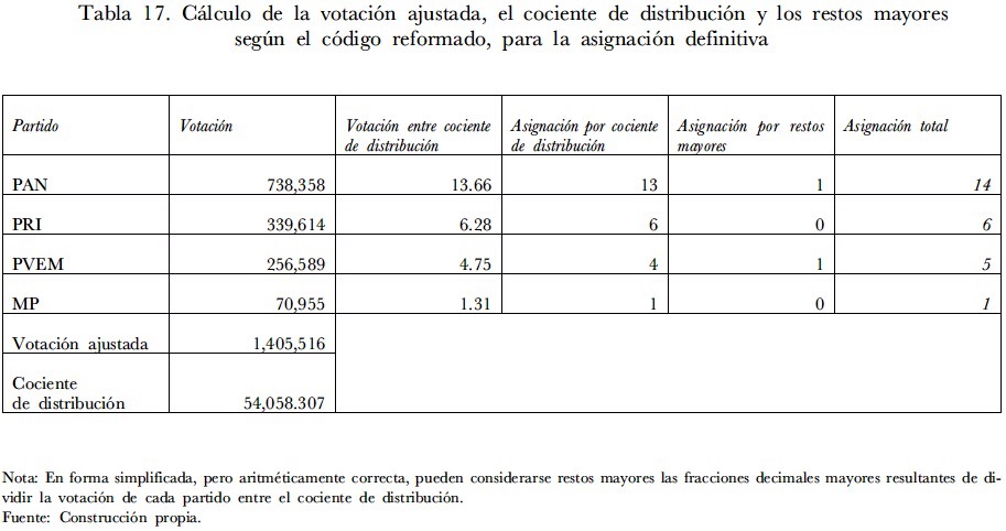 El código reformado subsana dicha laguna y, en este aspecto, elimina una fuente de litigiosidad. Sin embargo, el código reformado deja subsistente la extrema complejidad de la fórmula a aplicar, que hace difícil para partidos, candidatos, autoridades electorales y sobre todo ciudadanos entender cómo los sufragios se transforman en representación. La representación proporcional, a juicio de los autores, debería sujetarse a una fórmula mucho más sencilla, que haga transparente para los ciudadanos entender cómo su voto da lugar a la asignación de escaños.