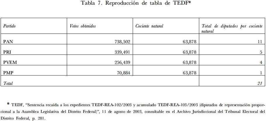 Para asignar las restantes 22 diputaciones de representación proporcional a los demás partidos con derecho, el TEDF siguió el procedimiento de cociente natural descrito en el inciso b) del artículo 13 del código. Para esto, restó la votación del PRD a la votación efectiva, llegando a la cifra de 1, 405, 316 votos; dividió esta cifra entre el número de diputaciones restantes de asignar (22), obteniendo el cociente natural de 63, 878 votos en números enteros; y dividió la votación de los otros partidos con derecho a diputaciones de representación proporcional entre este cociente (tabla 7).