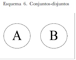 Si los elementos de dos conjuntos contienen elementos diferentes, esto es, que los elementos de uno y otro conjunto no son comunes, entonces se les llama conjuntos-disjuntos. A y B son disjuntos entre sí, sí y solo si carecen de elementos comunes, es decir, si no existe ninguna cosa que sea a la vez elemento de A y elemento de B, es decir, si su intersección es nula.31
