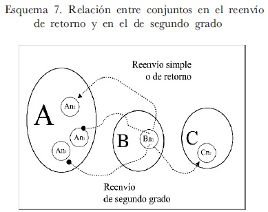 En el reenvío, diríamos que el elemento normativo An1 (una norma de conflicto) hace posible que Bn1 (una norma de conflicto de Bn) se incorpore a A, y haga posible que la norma sustantiva que regula el supuesto (el establecido en An1) sea regulado conforme a Bn2 (caso en que se trata de un reenvío de retorno) o por Cn2 (caso en que se trata de un reenvío de segundo orden). En este último, si el reenvío se produce hacia la norma sustantiva de un tercer Estado, entonces An incorpora a Bn1, que a su vez, incorpora a Cn2 (la norma sustantiva de un tercer Estado). Al final de cuentas, An1 incorpora a Cn2. Véase el esquema número siete en la próxima página.