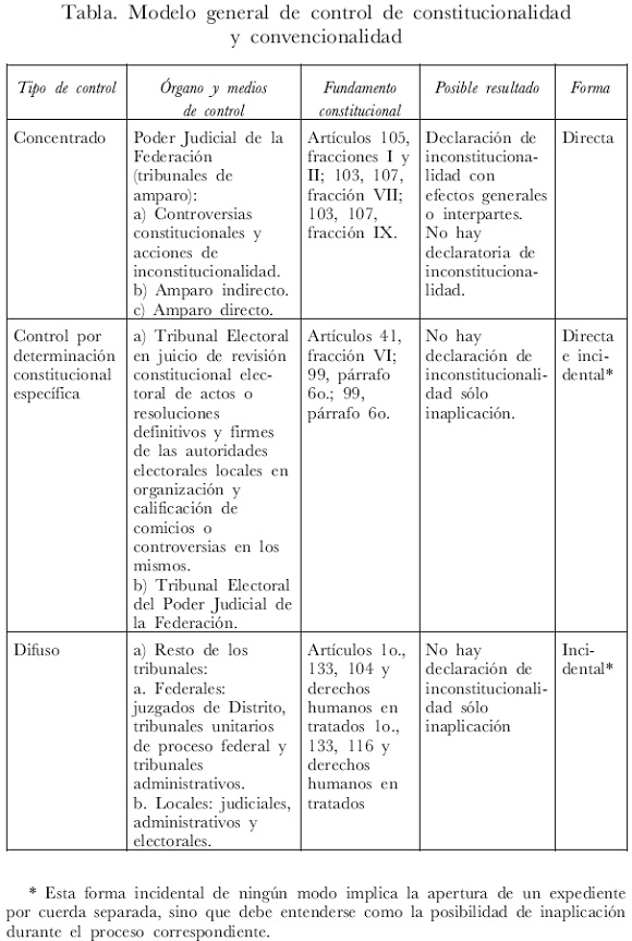 Este control convencional, que según los autores consiste en el deber de los jueces nacionales de realizar un examen de compatibilidad entre las disposiciones y actos internos (del caso concreto), con los tratados internacionales y la jurisprudencia de la Corte Interamericana de Derechos Humanos, tiene incidencia directa con el sistema de control constitucional de nuestro país, en razón de lo cual, la Suprema Corte al analizar los efectos de la sentencia del caso Radilla Pacheco acordaron sobre el "Modelo general de control de constitucionalidad y convencionalidad" (véase tabla en la siguiente página).