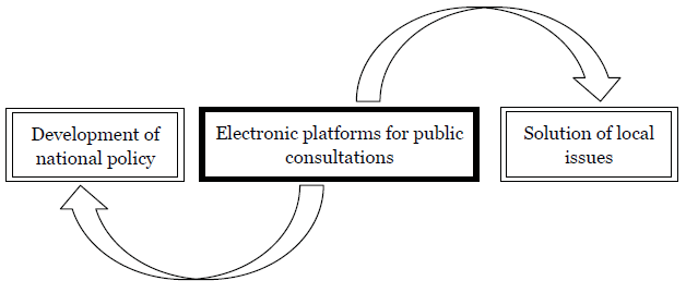 Figure 1 schematically shows two main (but not the only ones) tasks of digital platforms for public consultations: forming national policy and solving local issues. In other words, it becomes clear that public consultations can be divided into consultations on national policy issues and consultations on local self-government (Amanbek et al., 2020). To confirm or refute this provision, an analysis of the practice of implementing electronic platforms in different countries of the world was carried out.