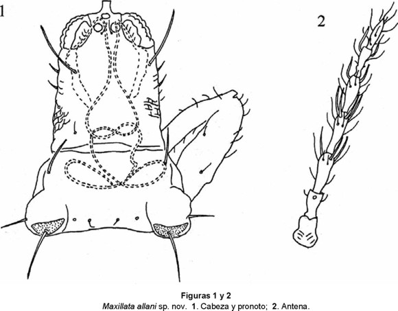 Esta especie difiere de M. priesneri y M. tremblayi por la disposición de los estiletes maxilares, los cuales están cercanos entre sí en la parte anterior de la cabeza y se prolongan por encima de los ocelos (Fig. 1), aspecto que no se observa en las especies anteriormente citadas. Asimismo, se puede diferenciar de M. tremblayi por la coloración de los segmentos antenales que tienen la siguiente coloración en M. allani: I-II castaño pálido, III-IV castaño-amarillento y V-VIII amarillos; así como el par de sedas postoculares agudas. El hallazgo de esta especie representa un registro nuevo de distribución geográfica, ya que solamente se conoce para Sur Africa y Jamaica (Mound & Marullo 1996). Esta especie está dedicada al amigo y entomólogo Allan González Herrera que trabaja con el Orden Lepidoptera y sus parasitoides.
