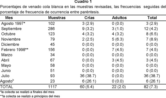 Se colectaron 1,117 heces entre agosto de 1997 y agosto de 1998. A nivel anual sólo en 82 heces (7.3 %) se detectaron restos de venado cola blanca, de las anteriores en 60 (5.4%) se identificaron restos de crías, mientras que pelo de adultos se detectó en 22 (2.0%) de las muestras. Del análisis mensual destacan los siguientes resultados; los restos de cervatos se encontraron en las heces colectadas de agosto a noviembre de 1997 en porcentajes que varían de 2.5% a 3.2%, mientras que de 1998 solamente las muestras de julio y agosto fueron positivas con 38.7% y 26.1 % de FO respectivamente. De las 36 heces colectadas en julio donde se identificaron restos de cervatos, 33 de estas se recogieron sobre una superficie aproximadamente de 20 m2, y por sus características de tamaño eran de crías y adultos de coyote. Restos de venados adultos aparecen en las heces colectadas de septiembre a noviembre de 1997 además de febrero y abril de 1998, sus porcentajes fluctúan entre 1.0 % y 6.3 % (Cuadro 1).