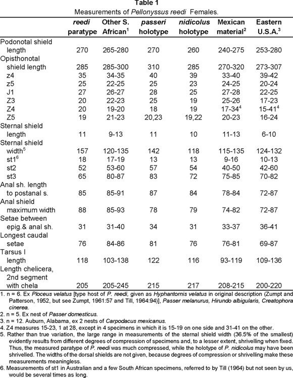 Till (1964) published a scholarly revision of Pellonyssus that continues to be the primary source for information on the genus. She was first to report the synonymy of P. passeri under P. reedi, apparently based on the literature only. Our comparison of the holotype of P. passeri with a paratype from the same collection as the holotype of P. reedi, as well as other material from South Africa, sustains her conclusion. Comparison of other material from South Africa, Mexico, and the eastern U.S.A. adds more weight to her interpretation.