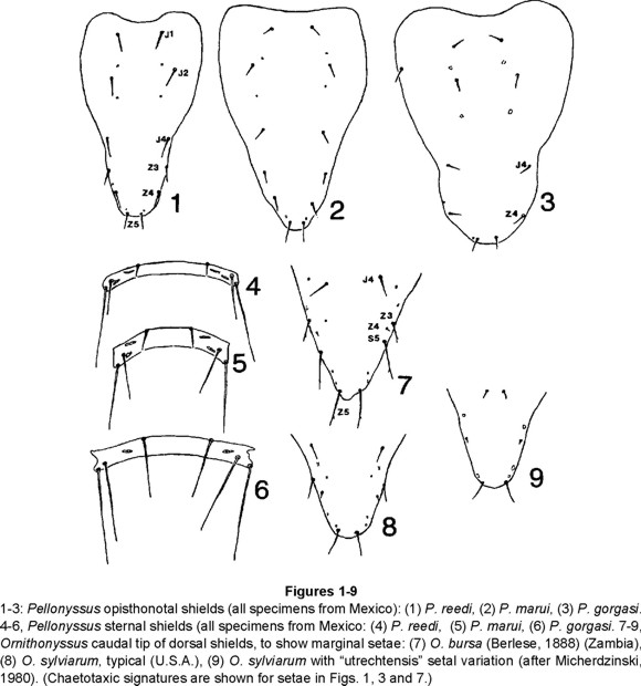 Figures 1-6 show the opisthonotal shield and the sternal shield of each of the 3 species of Pellonyssus found in the New World. The labelling of the penultimate seta on the opisthonotal shield is here Z4, changed from Radovsky (1998) (where given as S5) due to a reevaluation of the chaetotaxy as part of a general revision of the Macronyssidae. Text references to Z4 in Radovsky (1998) can be similarly corrected to Z3. A text reference in that paper to J5 as being present on the protonymphal pygidial shield is a lapsus calami and should read Z5.