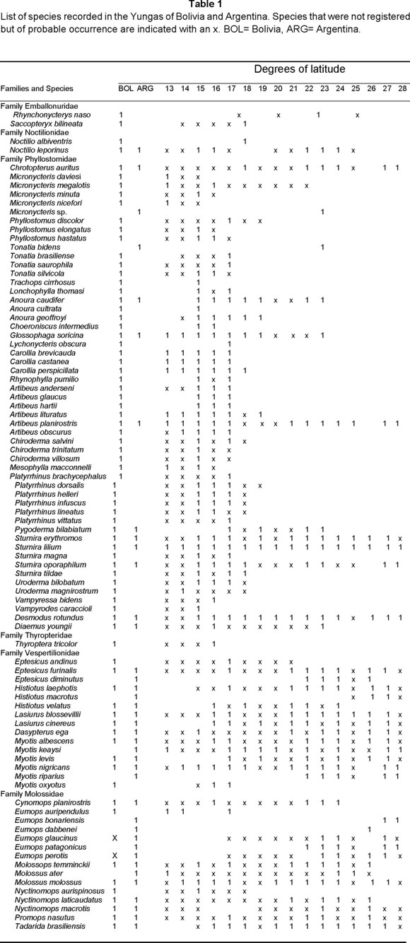 In this study we analyze the composition of bat species of the Argentine Yungas, where 39 species have been recorded, number that indicates a high diversity of bats for the region compared with the total number of species in the country (66% of the species from Argentina). For comparative purposes we have incorporated in the analysis a revision of the species of the Bolivian Yungas. Since the mid-1970's, intensive field studies and surveys have been carried out in numerous localities of the Yungas in Argentina. The information obtained from personal collecting, plus the examination of museum specimens and literature records, allowed us to examine a total of 1682 specimens. One noctilionid, 12 phyllostomids, 13 vespertilionids, and 13 molossids were recorded in the area. For every species we include the specimens examined, additional records, distribution, reproduction and also provide additional comments related to the biology of the species observed by us during fieldwork studies. Biogeographical analyses were made considering the presence or absence of each species by degree of latitude along latitudinal gradients. The Yungas of Argentina was also compared with that of Bolivia and with other phytogeographic provinces, such as Chaco, Monte, Andean, and Paranaense regions, located at the same latitudinal range as the Yungas in Argentina.