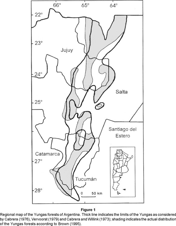 The ecosystem, as it exists in Argentina, is considered to be threatened (Prado, 1995) mainly due to the lack of control of human actions. From the descriptive point of view, the Yungas has been the object of several approaches to classification, especially regarding the denomination of their strata (Brown, 1995; Meyer, 1963; Morales et al. 1995; Prado, 1995). Consequently, the Yungas includes areas that are not forests, such as high grasslands, or places above 2000 m. Thus, some of the species included in our study are those that are not typical of the Yungas forests but rather typically inhabit dry or arid units, like the Monte, Chaco, or Andean.