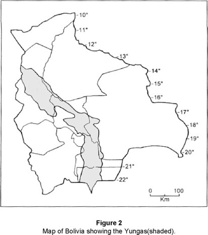 The limits of the Yungas in Argentina (Fig. 1) are based on the work of several authors (Brown, 1995; Vervoorst, 1979, 1982; Cabrera, 1976; Cabrera and Willink, 1973). For Bolivia the region (Fig. 2) has been defined based on the information given by Anderson (1997), Anderson et al. (1982), Anderson and Webster (1983), and Charts of the Geographical Military Institute of Bolivia.