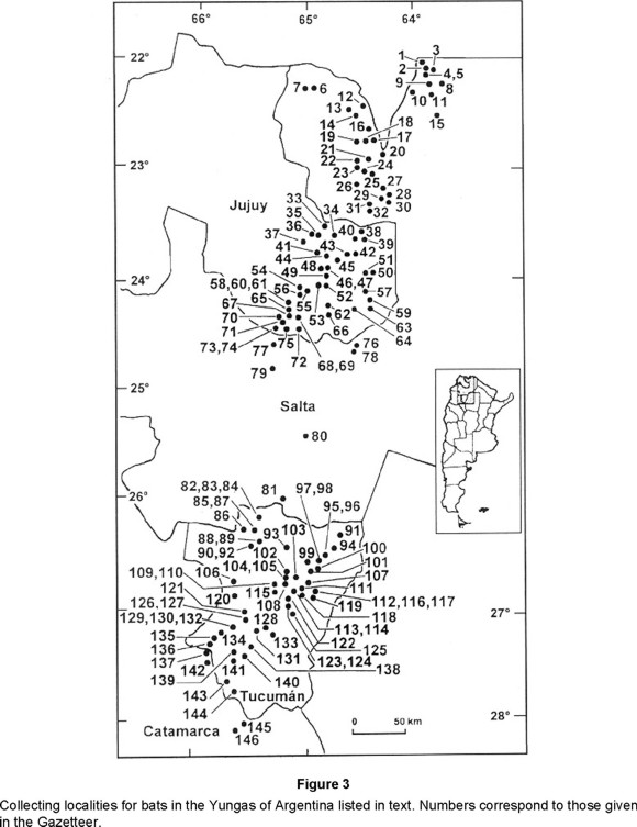 We thank to members of the PIDBA (Programa de Investigaciones de Biodiversidad Argentina) for their cooperation in the field trips, especially to David Flores, Analía Autino, and Norberto Giannini. Pablo Martinez has also collaborated in fieldwork and preparation of specimens. Drs. Michael A. Mares and Janet K. Braun are especially thanked by their invaluable support in all matters. We thank the curators of the collections mentioned in Methods, for allowing us to study the specimens under their care. S. Anderson, H. Genoways, D. Schlitter, D. Wilson, and the late K. Koopman, provided special assistance to RMB during extended visits to the collections. R. A. Ojeda collaborated in a large part of the first stages of collecting data for this work and also by discussions about the latitudinal gradients of the argentine Yungas. Janet Braun and Paul Handford have helped in editing an earlier version of the manuscript. The CONICET has facilitated this work through a grant to R. M. Barquez and several fellowships to M. M. Díaz. Also FOSDIC made possible the revision of the systematic collections of Argentina, USA, and London, by a grant given to M. M. Díaz. The studies at the Natural Reserves of Tucumán Province, were partially funded by the Biodiversity Support Program (World Wildlife Fund, Nature Conservancy, and World Resources Institute). The National Parks of Argentina (APN) offered economic support to R. M. Barquez making possible several trips to northwestern Argentina. Finally we thank to the University of Tucumán for facilities offered to the authors.