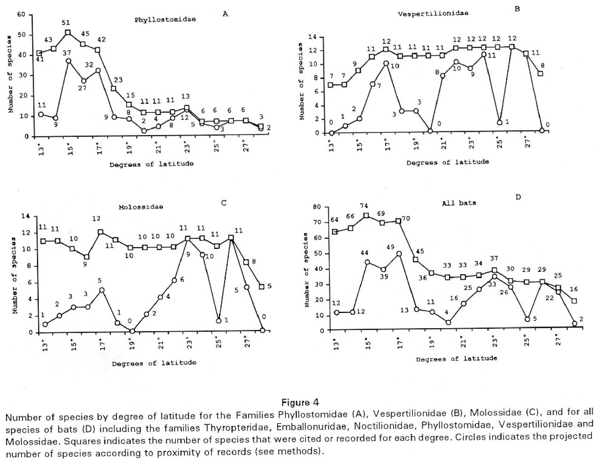 Vespertilionids and molossids contribute to an increase in the total number of species between 19° and 23° south latitude. If we include the species with probable occurrence, a curve would be somewhat constant between the 19° and the 27° of latitude (Fig. 4). The decrease in the number of species of phyllostomids is undeniable, even when the species of probable distribution are included, and the decrease is marked.