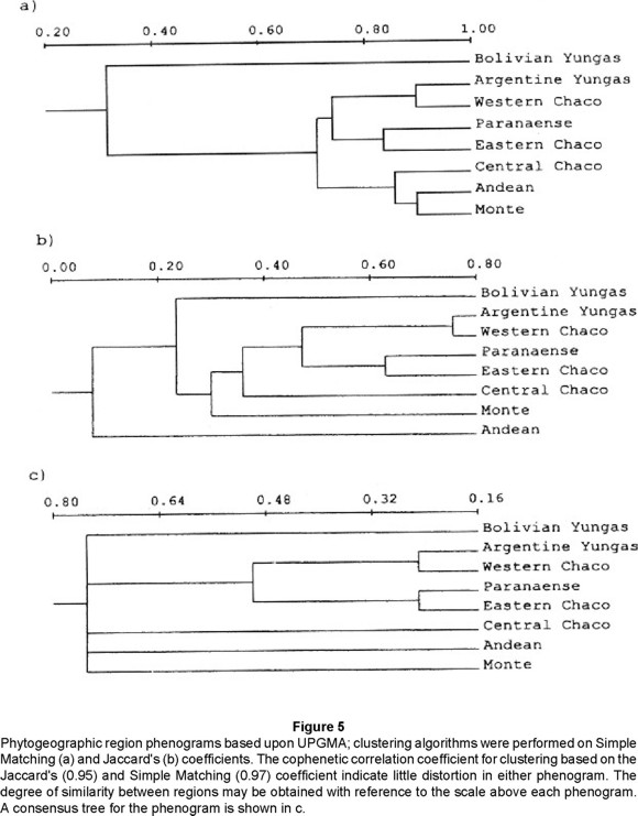 As a result of the use of the Simple Matching (Fig. 5a) and the Jaccard (Fig. 5b) coefficients of similarity, a consensus of five divisions was obtained (Fig. 5c). The Yungas of Bolivia form a discrete cluster. The Yungas of Argentina, the Western Chaco, the Paranaense forests, and the Eastern Chaco, form a cluster that represents zones of higher humidity in comparison with more arid regions (Central Chaco, Andean, and Monte), which each represent a different cluster.