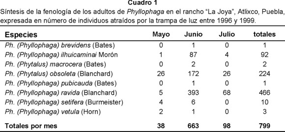 Los adultos de las tres especies predominantes de Phyllophaga muestran ligeras diferencias en estrategia de actividad: P. obsoleta es dominante durante mayo y su actividad se incrementa mucho en junio y decrece en julio; P. ravida aparece en mayo pero domina ampliamente en junio y con moderación en julio; y P. ilhuicaminai prácticamente inicia sus vuelos en junio y decrece notablemente en julio (Cuadro 1).