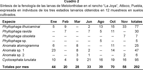 El predominio de las larvas de P. ilhuicaminai en las muestras de suelo de los terrenos cultivados (Cuadro 2) sugiere que las larvas de P. ravida y P. obsoleta de esa localidad se desarrollan principalmente en los terrenos no cultivados de la periferia del rancho, o en otros cultivos fuera del área estudiada, y que la capacidad de vuelo de los adultos permite registrarlos en las trampas de luz. Como puede observarse en el Cuadro 2, las larvas de Cyclocephala lunulata fueron las más abundantes y constantes durante casi todas las épocas del año, seguidas por Phyllophaga ilhuicaminai, Anomala sp. 1 y Phyllophaga ravida, aunque estas dos últimas especies no fueron recolectadas en todos los muestreos.