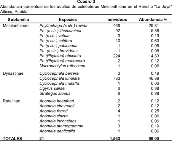 Cyclocephala Latreille. Se registraron tres especies de este género (Cuadro 3) representadas por 737 ejemplares, por lo cuál son equivalentes a un 47.15% del total de las muestras de adultos. Sus larvas representaron el 32.5% de las muestras en el suelo.