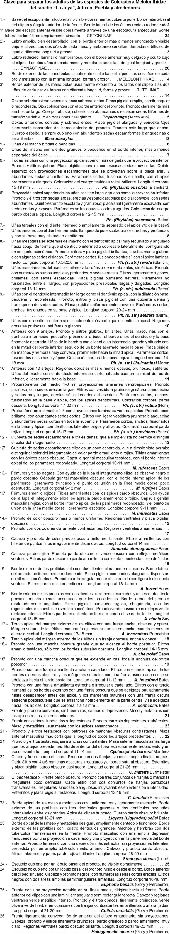 Se recolectaron un total de 1,563 individuos adultos y 292 larvas, que representan a 21 especies de seis géneros y tres subfamilias de Melolonthidae. A continuación se indican los datos biológicos y fenológicos de cada especie, y al final de ellos se presenta una clave dicotómica para su identificación.