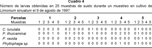 Es interesante apuntar que durante el trabajo de campo en "La Joya", en otras parcelas de la región de Atlixco se observaron densidades de 18 larvas de Melolonthidae por metro cuadrado en cultivo de Tagetes lunulata, de 36 larvas/m2 en cultivo de Raphanus sativus y de 60 larvas/m2 en cultivo de Celosia argentea. En este último caso el agricultor registró una pérdida del 30% del producto. En "La Joya" una densidad de 11 larvas/m2 causa daños importantes en las raíces de Limonium sinuatum (Aragón & Morón 1998).