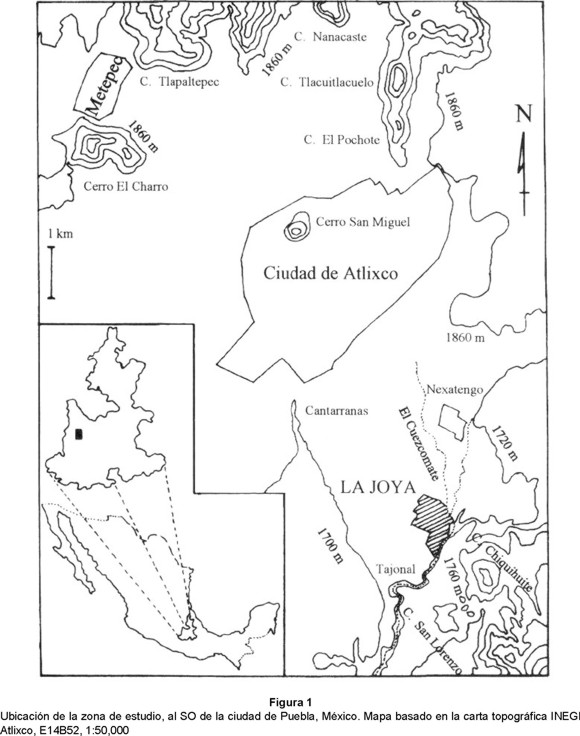 Área de estudio. El rancho "La Joya" se encuentra situado a 1,700 m de altitud, en el municipio de Atlixco (18°52'04" N y 98°24'00" O) (Fig. 1). La topografía es ondulada o plana, aunque al este colinda con el cauce profundo del río Cuezcomate, tributario del río Nexapa, y 1 km al sureste se ubica el cerro Chiquihuite, que supera los 1,850 m, y forma parte de la prolongación de la sierra del Tentzo. El subsuelo contiene aluviones del Terciario Superior, tobas imbricada con basaltos y brechas volcánicas del Cuaternario, sobrepuestos a calizas del Cretácico (INEGI 1987).