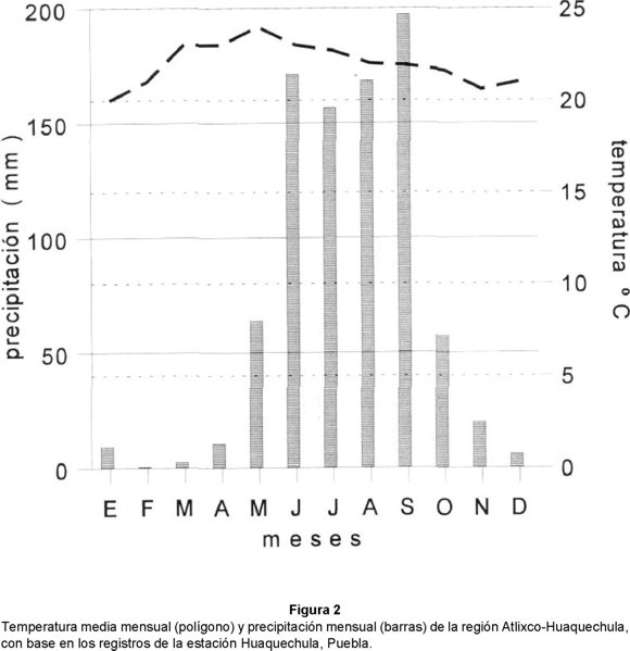 En esta zona convergen dos tipos climáticos: templado subhúmedo con lluvias en verano (C [w]2 [w] ) con temperatura media anual de 12-18° C, y precipitación invernal inferior al 5% del total anual; y semicálido subhúmedo con lluvias de verano (A[C]w1 [w] con temperatura media anual de 18-22° C, y precipitación invernal inferior al 5% del total anual (Fig. 2). Debido a ello, la vegetación original estaba representada por una transición entre bosque tropical caducifolio, matorral xerofilo y bosque de encinos, ahora casi totalmente reemplazada por vegetación secundaria, pastizales y terrenos agrícolas con riego, en los cuáles se cultivan flores para exportación como "estatis" (Limonium sinuatum (L.) Miller; Plumbaginaceae) y "nardo" (Polianthes tuberosa L; Amarilidaceae), o flores para el mercado nacional como "gladiola" (Gladiolus grandis Thumb.; Iridaceae), "tzempoaxóchitl" (Tagetes erecta L; Asteraceae), "terciopelo"(Celosia argentea L.; Amaranthaceae) y "rosa" (Rosa spp.; Rosaceae), aunque también se alternan cultivos de maíz, alfalfa y hortalizas como rábano, cebolla y cilantro.